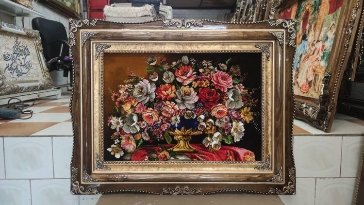 این تابلو دستبافت است و کیفیت عالی چله نخ و جنس گل های زیباش ابریشم هستش